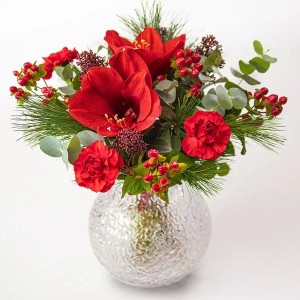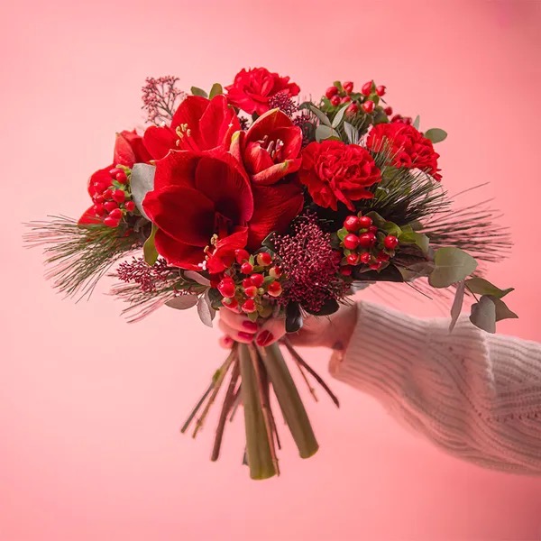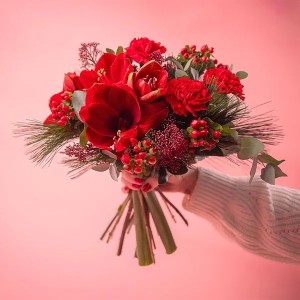 Ten piękny czerwony bukiet świąteczny zawiera kwiaty takie jak czerwony amarylis, goździki, hypericum i skimmia, a całość jest pięknie dopełniona gałązkami sosny i eukaliptusa. Głębokie czerwienie nadają kompozycji klasy i elegancji, a zieleń tworzy harmonijny kontrast, podkreślając świąteczny i nowoczesny charakter bukietu. Idealny sposób na przesłanie ciepłych życzeń na Boże Narodzenie.