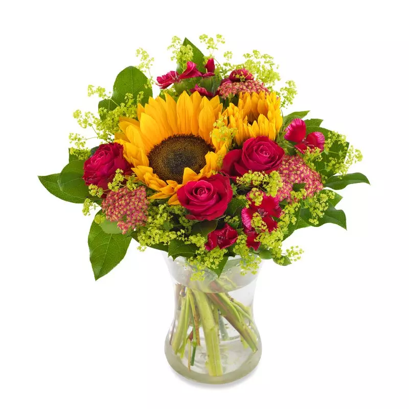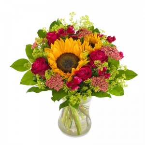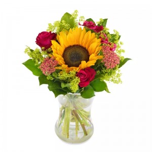 - W przypadku ograniczonej dostępności słoneczników w rejonie odbiorcy, aby zagwarantować terminową dostawę, w bukiecie mogą być użyte zamiennie alternatywne żółte kwiaty