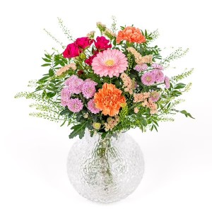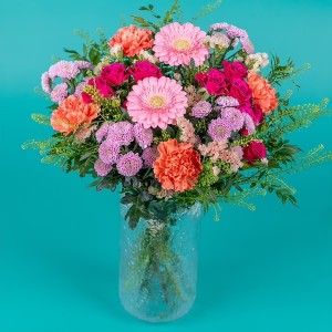 Radosny, pełen kolorów bukiet dla niej, dla niego, dla nich. Zawiera kwiaty takie jak pomarańczowe goździki, różowe santini, ciemnoróżowe róże gałązkowe, różowe gerbery, a całość dopełnia darmowe pastelowe opakowanie, które dodaje kompozycji nowoczesnego stylu. To energetyczny bukiet idealny na urodziny, podziękowania, gratulacje lub po prostu, by poprawić komuś dzień. Kolorowy bukiet ze stylowym opakowaniem, który daje piękny efekt w przystępnej cenie.