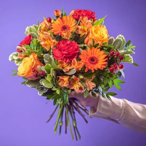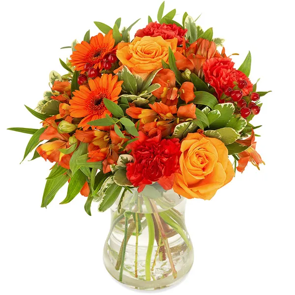 Bukiet w optymistycznych kolorach, który zamieni szary jesienny dzień, w chwile pełne kolorów! W jego skład wchodzą m.in.: goździki, róże, gerbery i sezonowe, zielone dodatki. Możesz do niego dołączyć bilecik z życzeniami. Kwiaty zostaną przygotowane i doręczone przez lokalną kwiaciarnię współpracującą z Euroflorist. Wazon nie jest wliczony w cenę.