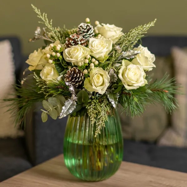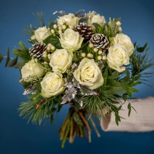 Elegancki i stonowany bukiet wykonany z białych róż lub eustom z dodatkiem świerkowych gałązek i szyszek. Zostanie wykonany przez lokalną kwiaciarnię, masz też możliwość dołączenia bileciku. Cena nie obejmuje wazonu.